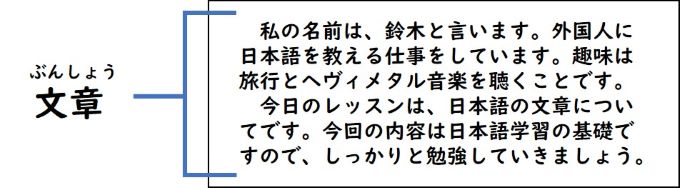 文章:複数の言葉を連ねて、まとまった内容を文字で表現したものが文章です。文章は、言葉で最も大きな単位です。