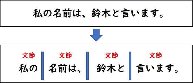意味が不自然にならない程度に文を細かく区切ったかたまりを文節と言います。