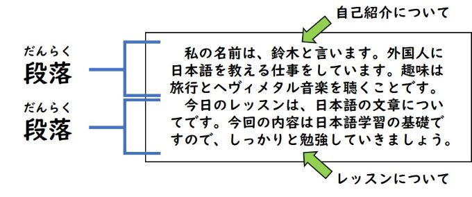 文章内でまとまった内容を表す一区切りを段落と言います。段落の初めは一文字下げて書き始めます。そして、段落の変わり目に改行をします。段落があることで読みやすい文章になります。